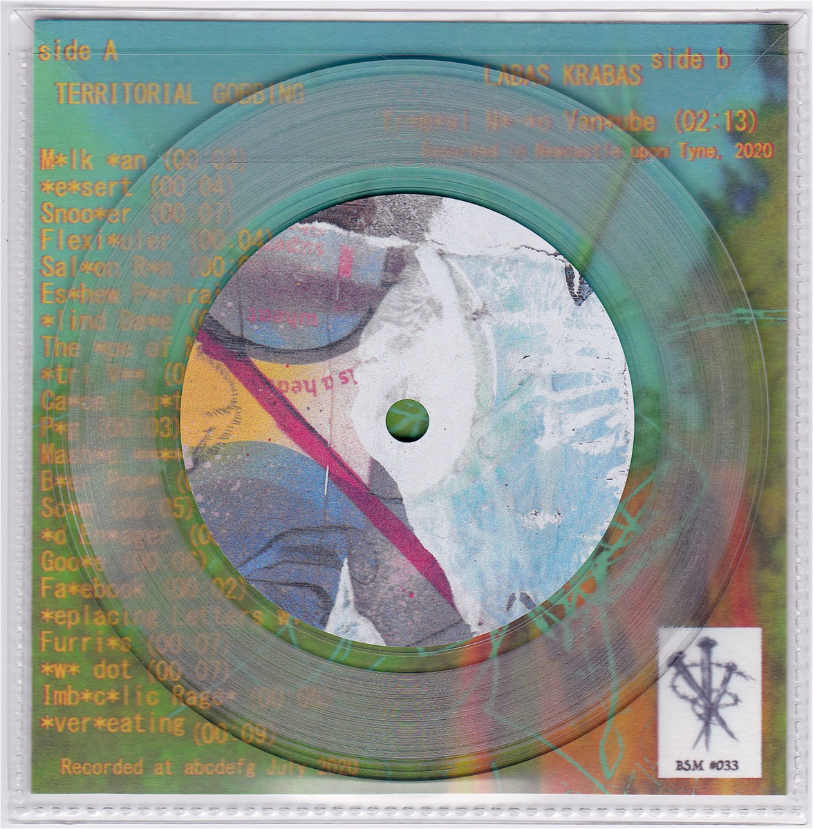 Split release… Side A supplies micro jank via Territorial Gobbing, 22 very small songs or one small song—it’s up to you really. On side b we have Labas Krabas dismantling the art of song.